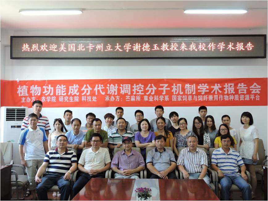 祖智波副院长首先简要介绍了谢教授和参会的领导和老师。谢德玉教授是美国北卡罗莱纳州立大学植物与微生物系终身教授。苜蓿等植物代谢工程领域的国际著名专家。先后承担了多项美国国家基金和美国农业部基金等研究课题。其代表性成就之一:从原花青素生物合成路径、主要功能基因和分子调节机理等方面解析原花青素的生物合成途径,取得过去50年中最重要的突破性进展;发现了原花青素新的合成路径,修正了现代植物生物化学和分子生物学教科书中关于原花青素生物合成途径的知识及植物生物化学教科书关于原花青素和花色苷两者的代谢概念等。已获得国际专利多项,在Science等高影响因子杂志发表论文20余篇,目前论文被引用近1000次。2009年8月,因其在原花青素生物合成研究领域的突出贡献,荣获北美植物化学学会雷希•杨年轻科学家奖。