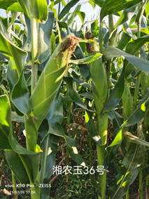 湘农玉36号由湖南农业大学农学院选育。2020年参加湖南省区域试验,平均亩产467.1千克,比对照增产4.7%;2021年续试,平均亩产542.1千克,比对照增产5.5%;两年区域试验平均亩产504.6千克,比对照增产5.1%。2021年生产试验,平均亩产547.4千克,比对照增产7.2%。该品种中抗纹枯病,抗小斑病,中抗茎腐病。籽粒容重772克/升,粗蛋白质含量9.4%,粗脂肪含量4.37%,粗淀粉含量70.58%,赖氨酸含量0.31%。