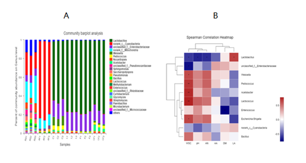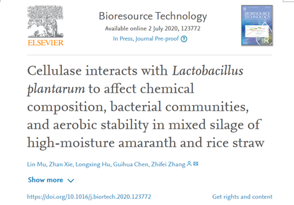 本网讯(农学院 徐倩)7月2日,我校农学院作物学专业17级博士生穆麟在生物资源技术领域国际权威期刊《Bioresource Technology》上发表了题为“Cellulase interacts with Lactobacillus plantarum to affect chemical composition, bacterial communities, and aerobic stability in mixed silage of high-moisture amaranth and rice straw”的混合青贮最新研究成果。该期刊最新影响因子为7.539,属于中科院一区Top期刊。作者指导老师张志飞教授为本文通讯作者,湖南农业大学大学为第一单位。该研究得到了国家重点研发计划和湖南省研究生科技创新项目的资助。 穆麟在张志飞教授的指导下,以高水分籽粒苋与水稻秸秆为试验材料,研究了植物乳杆菌和纤维素酶两种添加剂单独或复合添加对高水分籽粒苋水稻秸秆混合青贮的动态发酵品质、营养成分,有氧稳定性的影响,并利用高通量Miseq基因组测序技术对发酵终点混合青贮的细菌菌群组成进行分析,为籽粒苋及水稻秸秆饲料化高效利用提供理论依据和科学指导。该研究发现添加剂处理降低了Weissella、Pediococcus 和Lactococcus的细菌多样性和丰度,增加了Lactobacillus的丰度。菌酶复合添加剂处理组在发酵前7d乳酸含量显著高于其他各处理组(P<0.05),同时在青贮30 d明显降低了Enterobacteriaceae丰度。有氧暴露2 d后,对照组及菌酶复合添加剂处理组首先发生有氧腐败,而植物乳杆菌、纤维素酶单独添加有氧稳定性大于4d 。植物乳杆菌和纤维素酶复合添加进一步提升了发酵质量,而植物乳杆菌和纤维素酶单独添加具有更好的有氧稳定性。