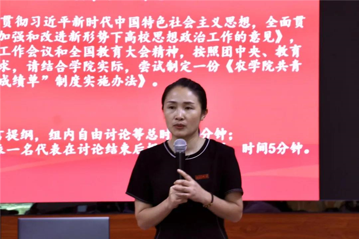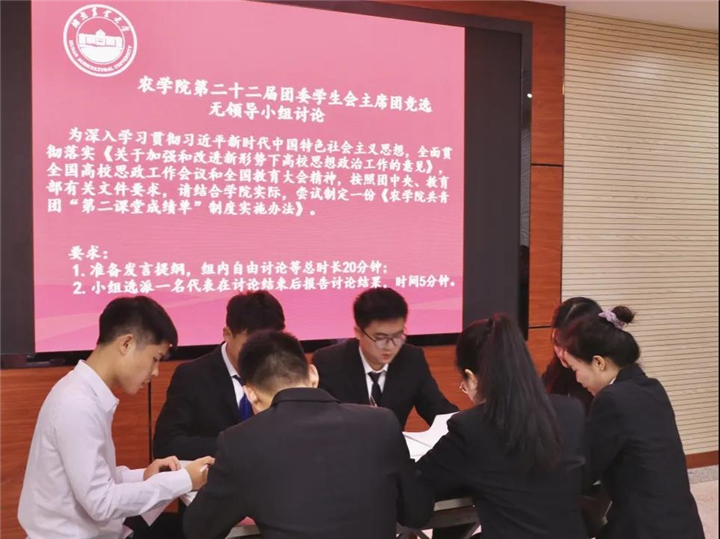 在无领导小组讨论环节,七位候选人对“制定一份《农学院共青团“第二课堂成绩单”制度实施办法》”展开讨论,张向同学作为代表总结发言。