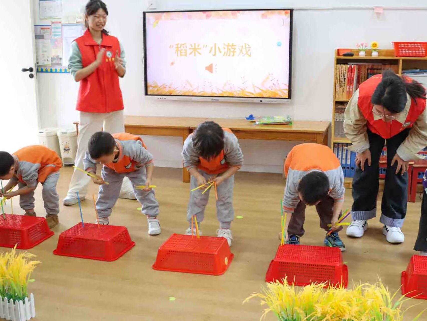 活动开始,志愿者借助生动的图文故事并且结合教具,将水稻从秧苗到成熟的生长历程娓娓道来,让孩子们直观地观察秧苗到稻穗的蜕变过程,将抽象的知识转化为可感体验。期间,志愿者抛出关于水稻生长的趣味问题,孩子们纷纷踊跃举手分享见解,志愿者则俯身倾听,耐心与孩子们互动交流,课堂氛围格外热烈。