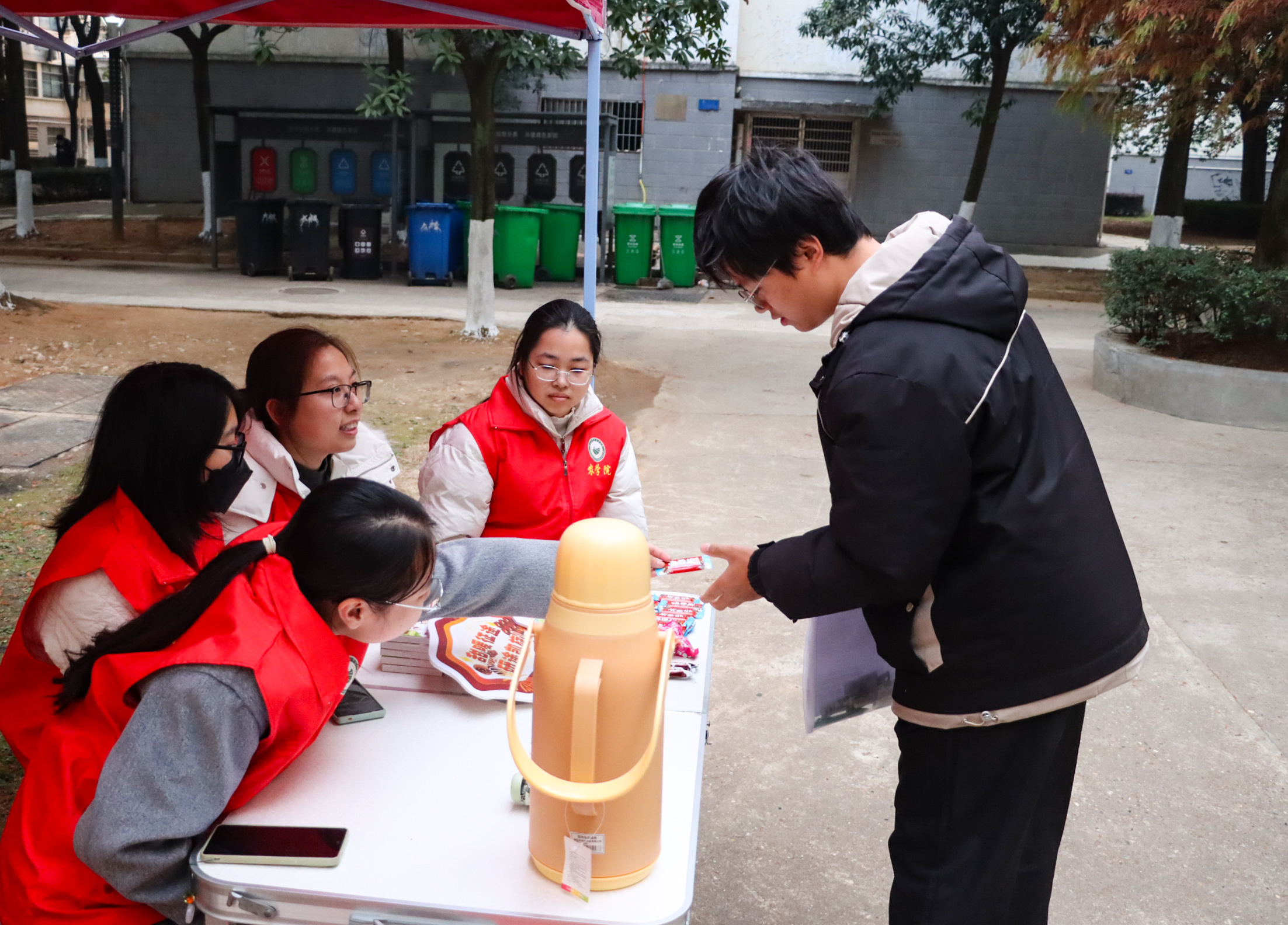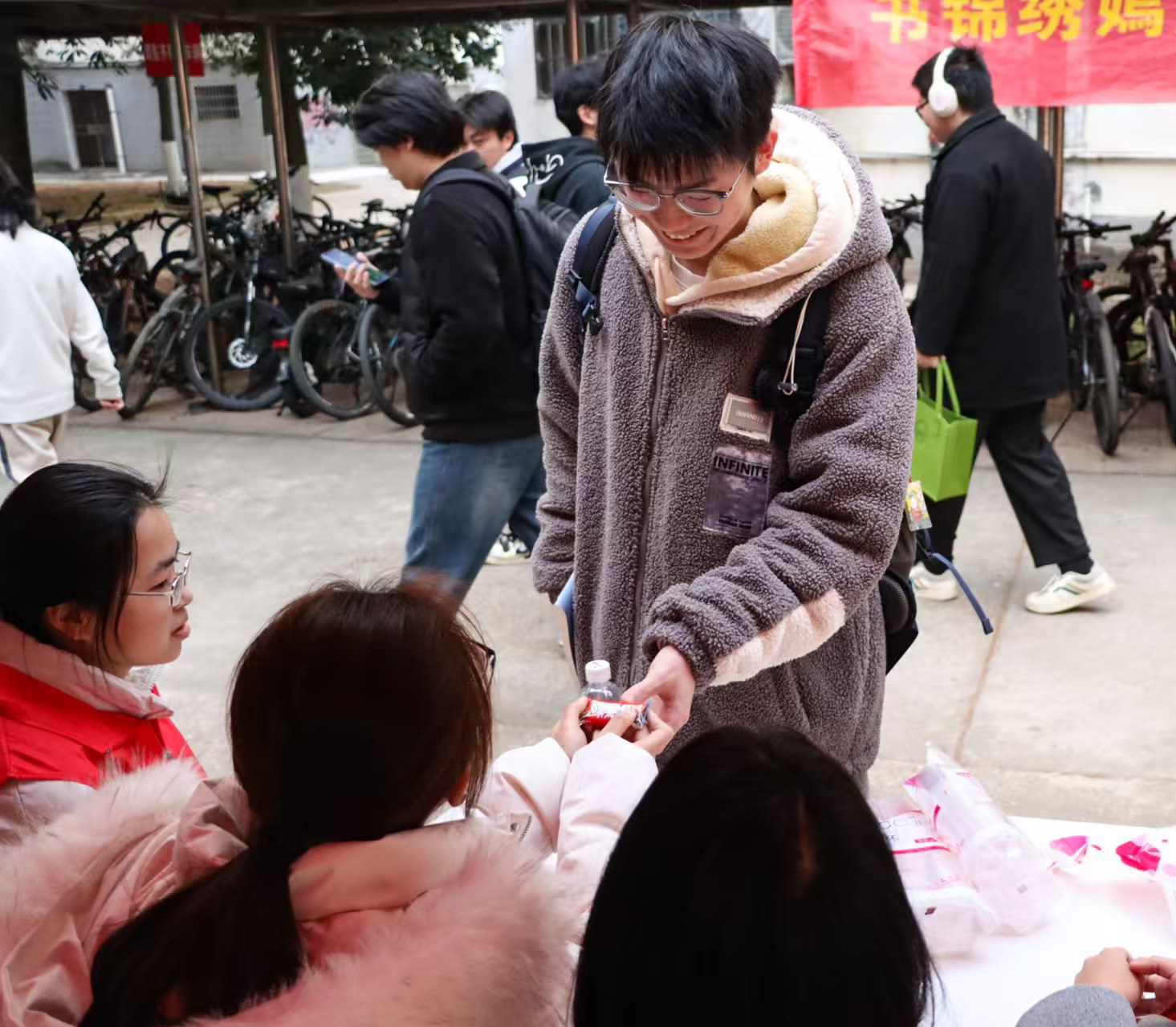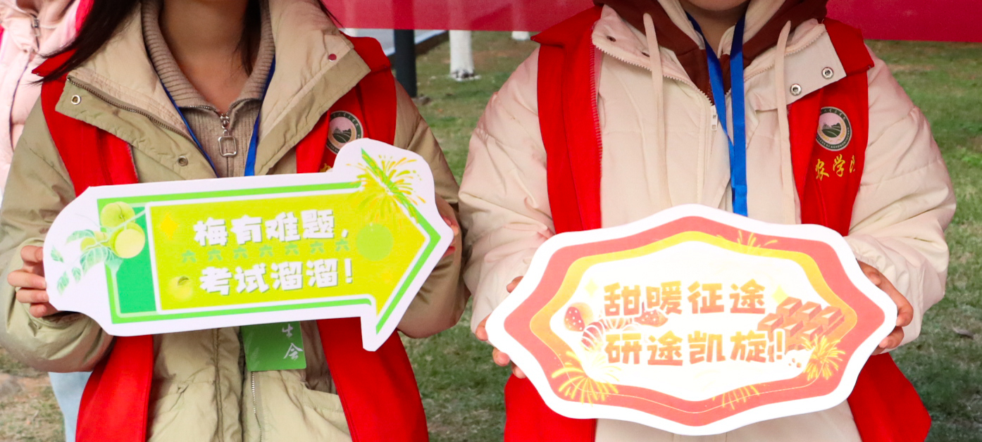 红色的帐篷在寒风中格外醒目,志愿者们忙碌的身影穿梭其间。精心准备的热饮驱散着冬日的凉意,香甜的糖果传递着甜蜜的期许,还有那些创意满满的应援牌——“梅有难题,考试溜溜”“甜暖征途,研途凯旋”,每一句都藏着农学院独有的巧思与心意。