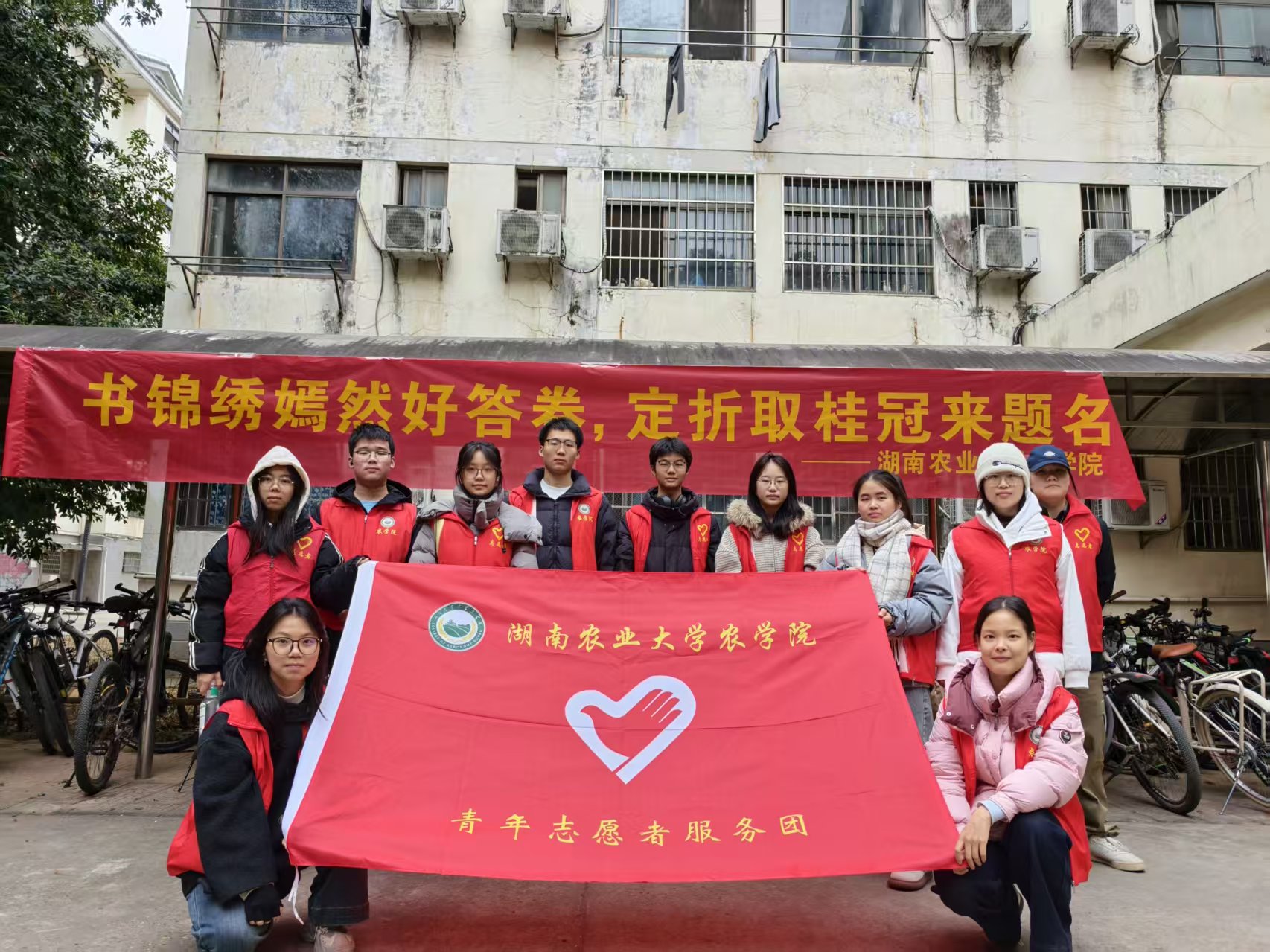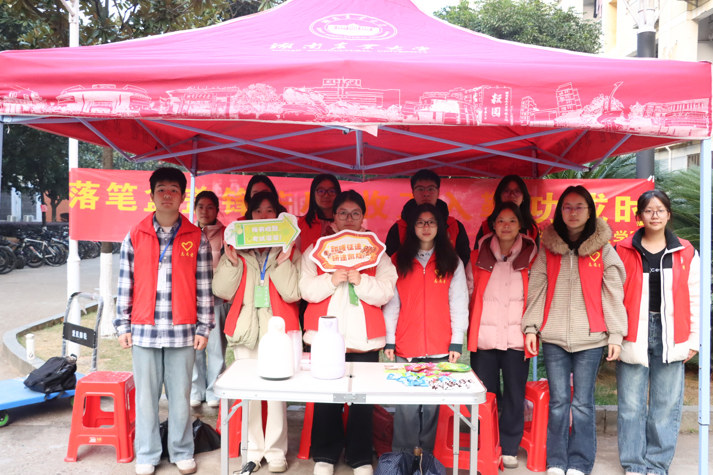 凛冬已至,梦想升温。当考研的倒计时进入冲刺阶段,湖南农业大学农学院的志愿者们早已整装待发,化身考研学子的“暖心后援团”,在校园里搭起爱心服务站,将一份份温暖与祝福送到奔赴考场的学长学姐手中。