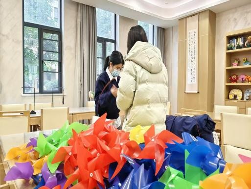 装饰过程中,志愿者们还不忘与老人互动交流。大家轮流前往老人活动区,用亲切温和的语气陪老人们唠家常、忆往事,耐心倾听他们的生活趣事;对于喜爱安静的老人,便静静陪伴在侧,协助整理衣物、擦拭桌椅,时刻关注老人的身体状态。一位老爷爷看到志愿者们忙碌的身影,忍不住夸赞“做得好”,还热情地塞来糖果;有老奶奶主动拉着志愿者合影留念,脸上洋溢着幸福的笑容,现场其乐融融。