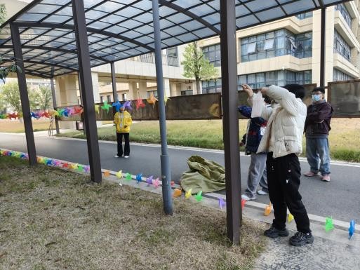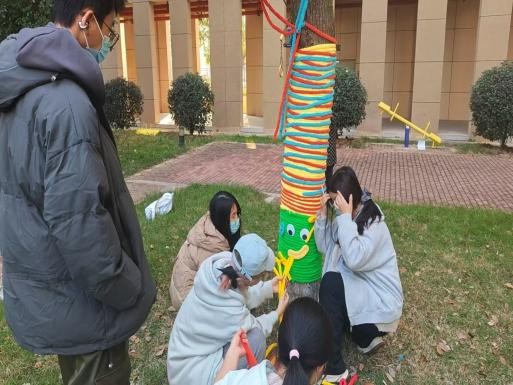 装饰现场一派热火朝天的景象:第一小组的同学们严格按照组装图纸,分工协作完成前院生命树大风车的零件拼接与固定,确保风车稳固美观;第二小组精心挑选色彩鲜艳的风车,串联成灵动别致的风车串,悬挂于前院围栏与长廊两侧,为院区增添了活泼气息;第三小组充分发挥创意,用彩色毛线与温馨祝福挂牌为后院大树“穿新衣”,让庭院焕发勃勃生机;第四小组的男生们合力拆除原有轮胎装饰,换上提前制作的可爱小羊造型摆件,为后院注入满满童趣。各小组同步推进、密切配合,遇到难题及时沟通解决,在规定时间内高质量完成了全部装饰任务。