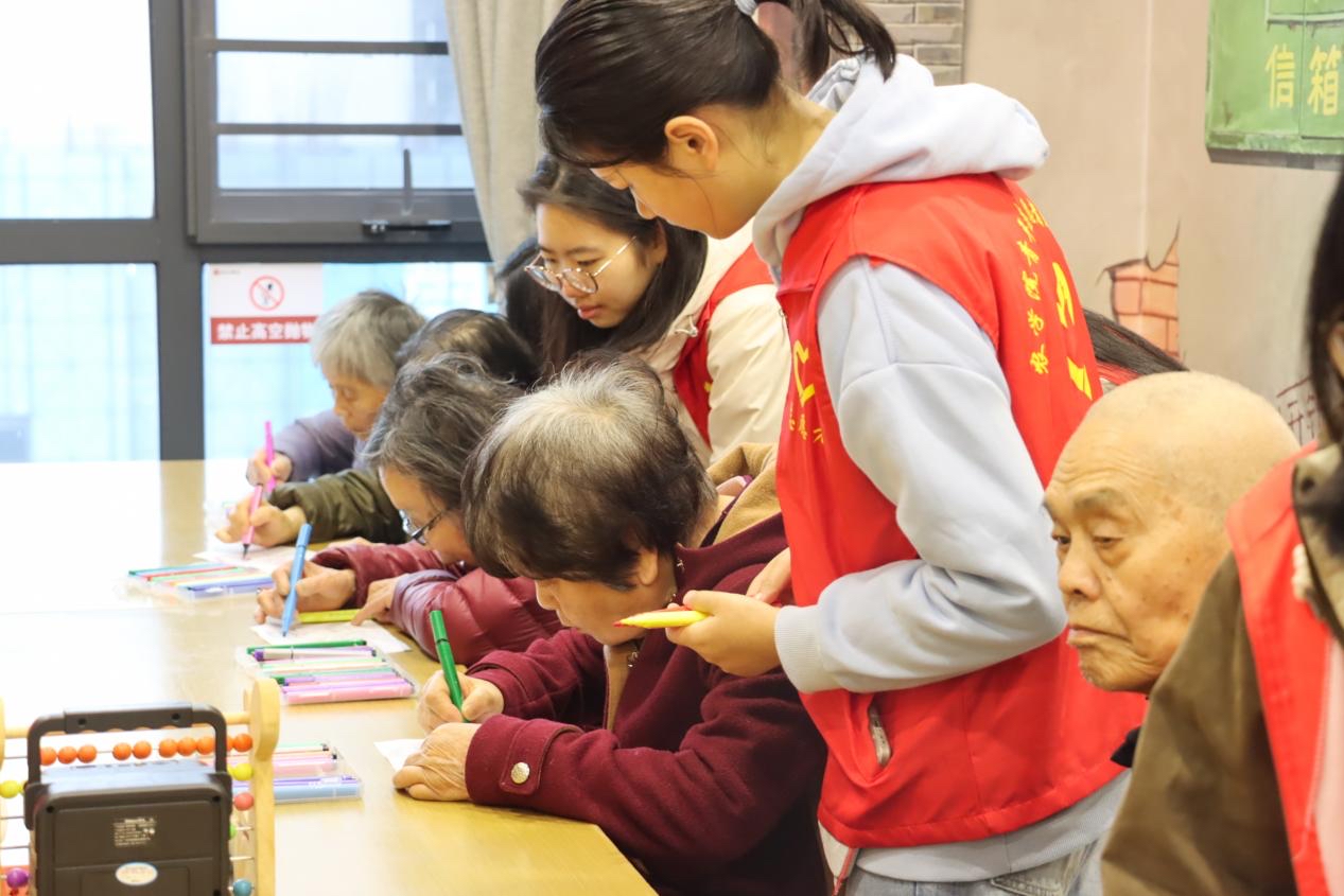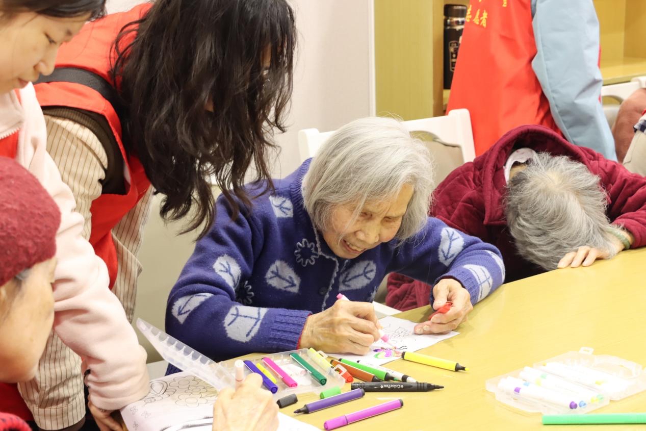 与此同时,志愿者们还搀扶行动不便的老人慢慢走动,陪着他们一起做简单的小游戏。游戏不分输赢,大家一块儿热闹热闹,有的奶奶赢了笑得直拍手,志愿者输了反而比谁都开心。屋里笑声不断,暖意融融。而后,志愿者们陪伴老人们一起使用彩笔画画,握着老人布满皱纹的手,一边轻声聊天,一边在画纸上共同勾勒有趣的画作。