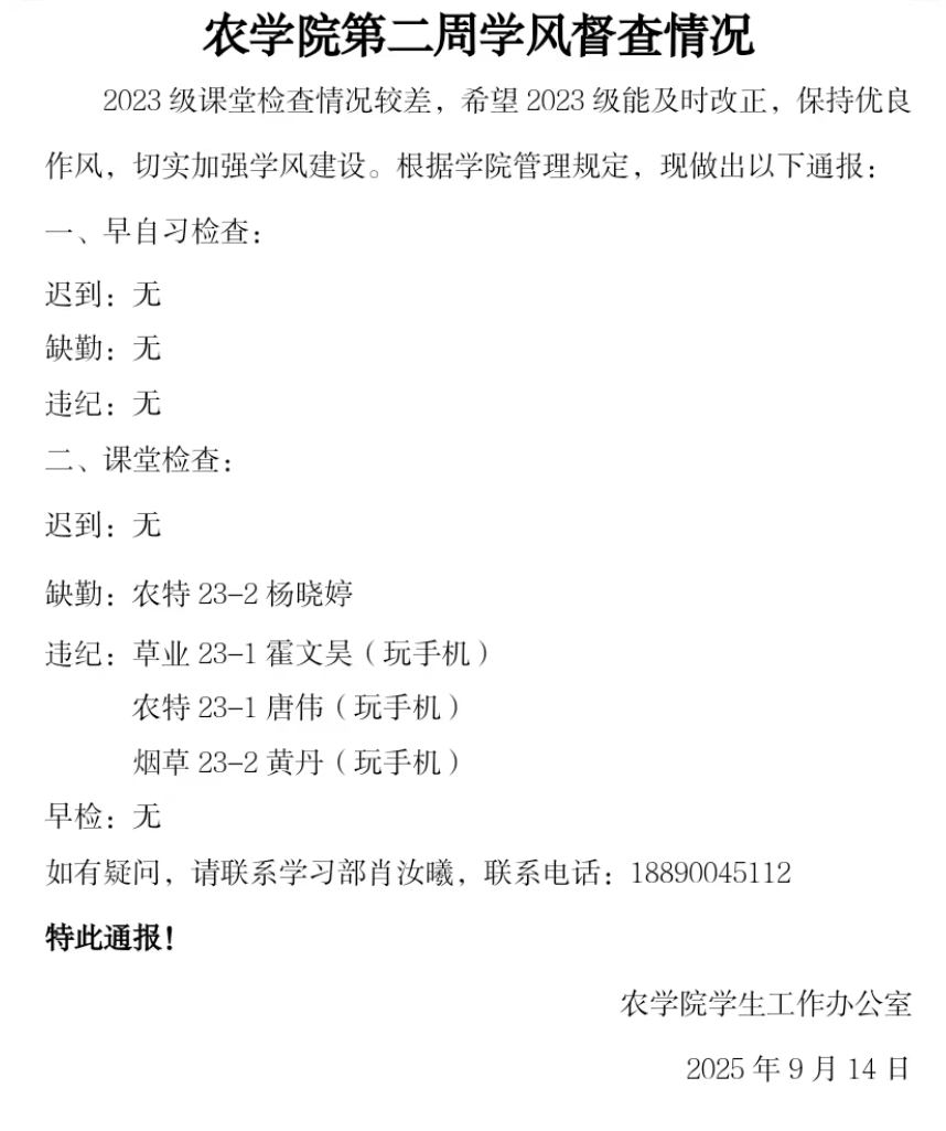 2023级存在缺勤和违纪现象,2024级和2022级表现优秀。希望2023级能及时改正并向2022级和2024级看齐,保持优良作风,切实加强学风建设