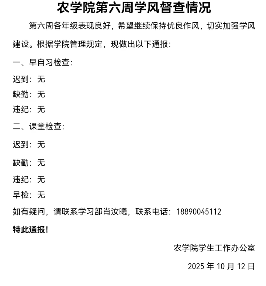 在第六周的课堂检查中,各年级均表现优秀。希望各年级保持优良作风,切实加强学风建设。