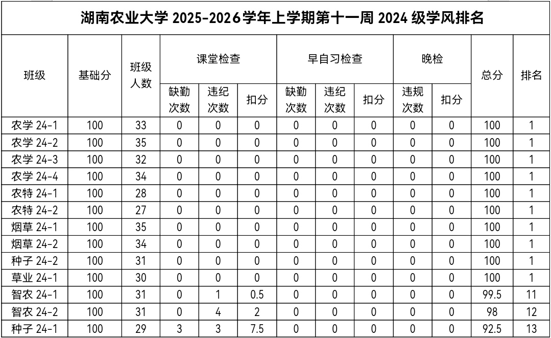 第十一周各年级均表现优秀,卫生情况良好,希望继续保持,同时也希望各年级保持优良作风,切实加强学院园区建设,共创美丽校园。
