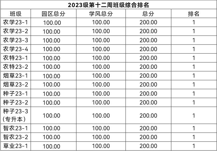 第十二周各年级均表现优秀,卫生情况良好,希望继续保持,同时也希望各年级保持优良作风,切实加强学院园区建设,共创美丽校园。