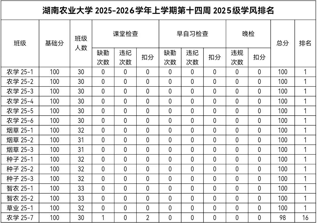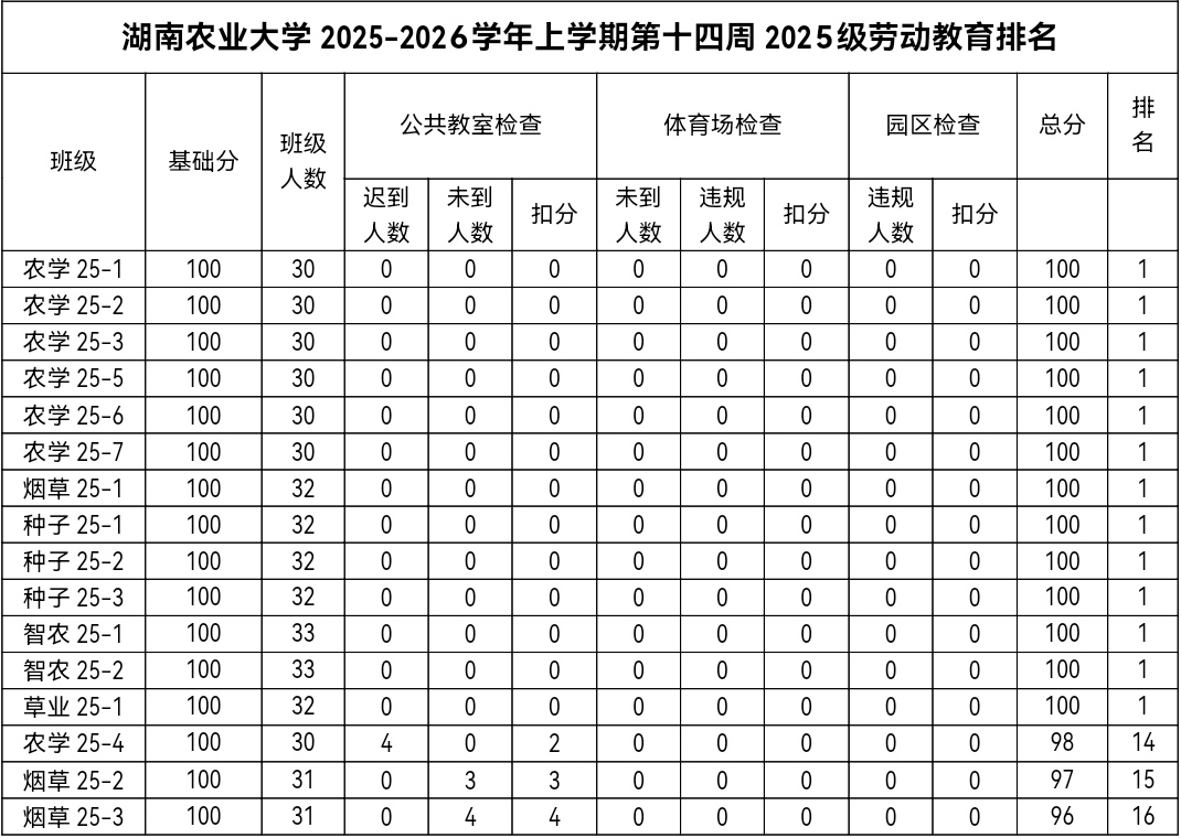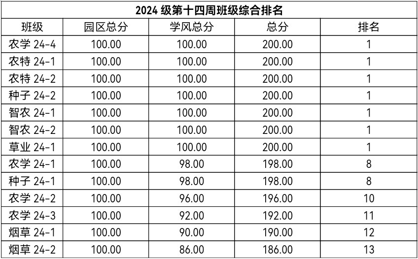 第十四周各年级均表现优秀,卫生情况良好,希望继续保持,同时也希望各年级保持优良作风,切实加强学院园区建设,共创美丽校园。
