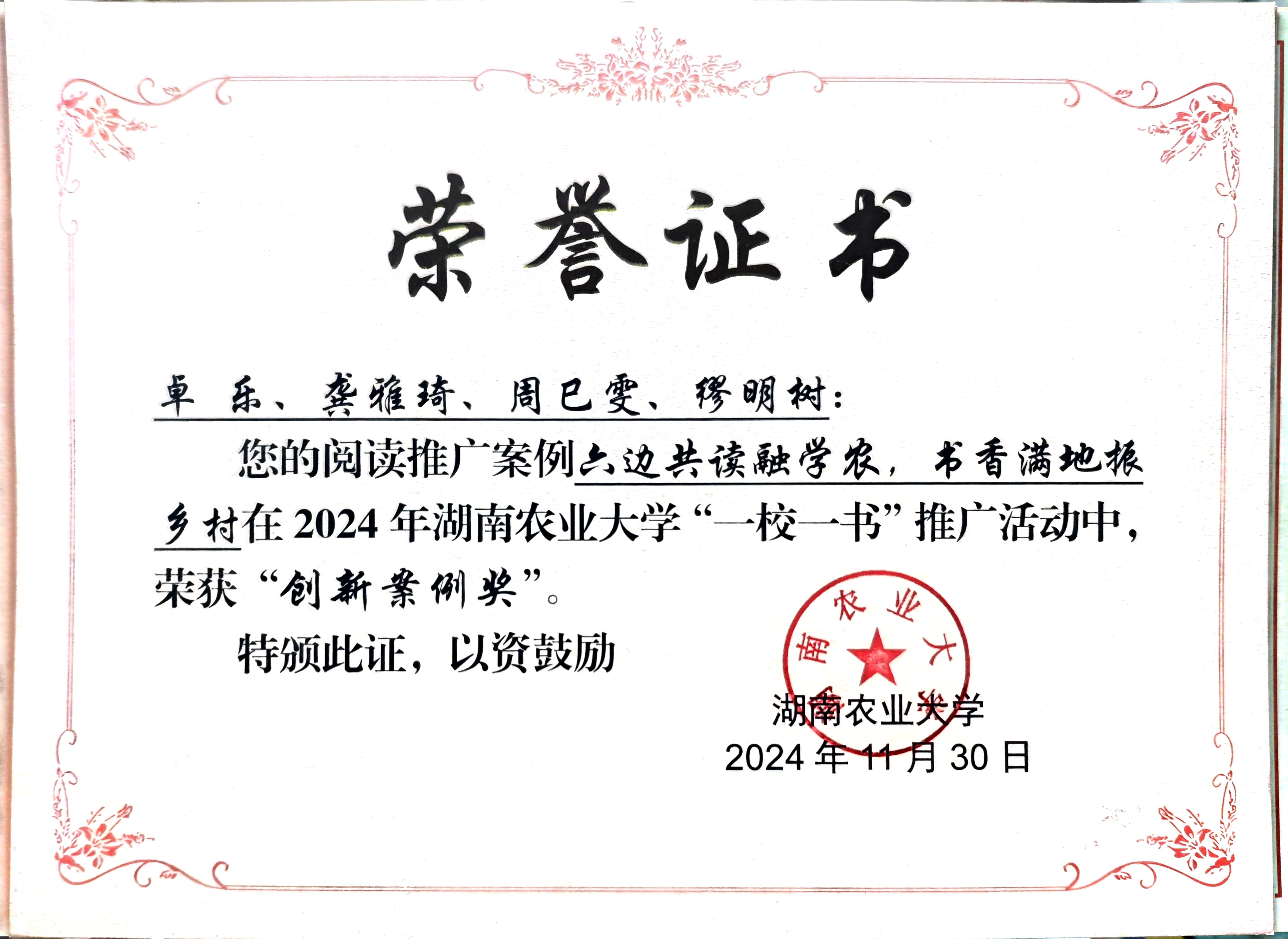 她积极参与各类校园文体活动,两度加入军训合唱团,多次代表学院征战校运会,带领班级参加“新生杯”篮球赛,加入院排球队斩获院系联赛亚军,在赛场与舞台绽放青春光彩。同时深耕学科竞赛与文字创作,斩获“读懂中国”主题教育征文校级特等奖、省级二等奖,“一校一书”读书报告院一等奖等荣誉;多篇稿件被学院融媒体中心采纳发布于湘农农学公众号,用笔墨传递校园向上力量。