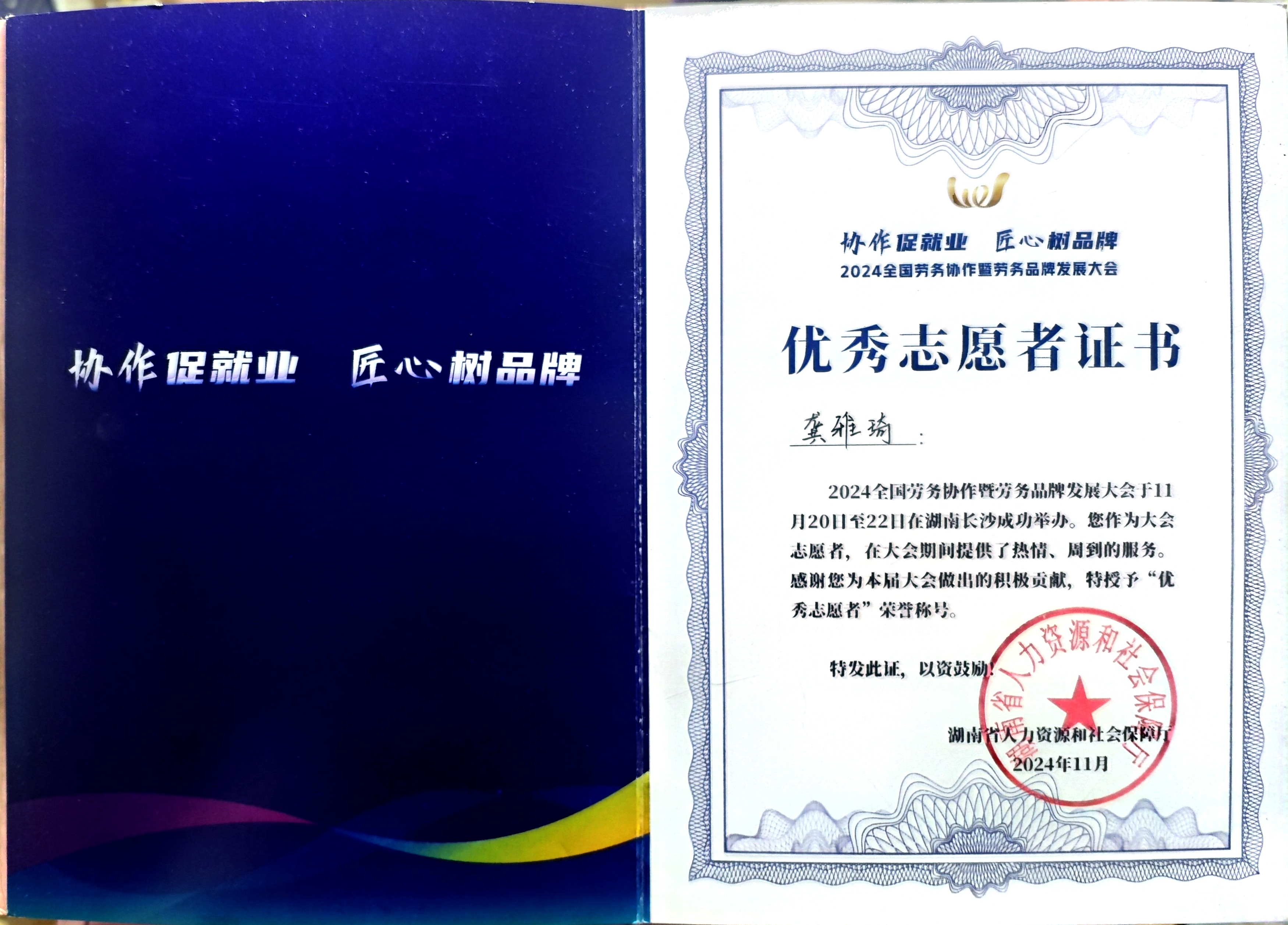 课余时间,她积极投身各类志愿服务,主动践行奉献精神,让闲暇时光更具价值与意义。她先后参与第二十届中国作物年会暨建会60周年庆祝大会、2024全国劳务协作暨劳务品牌发展大会的志愿服务工作,履职期间认真负责、踏实肯干,不仅顺利获得相关志愿证书,更获评2024-2025学年校级优秀志愿者,以实际行动诠释志愿精神。