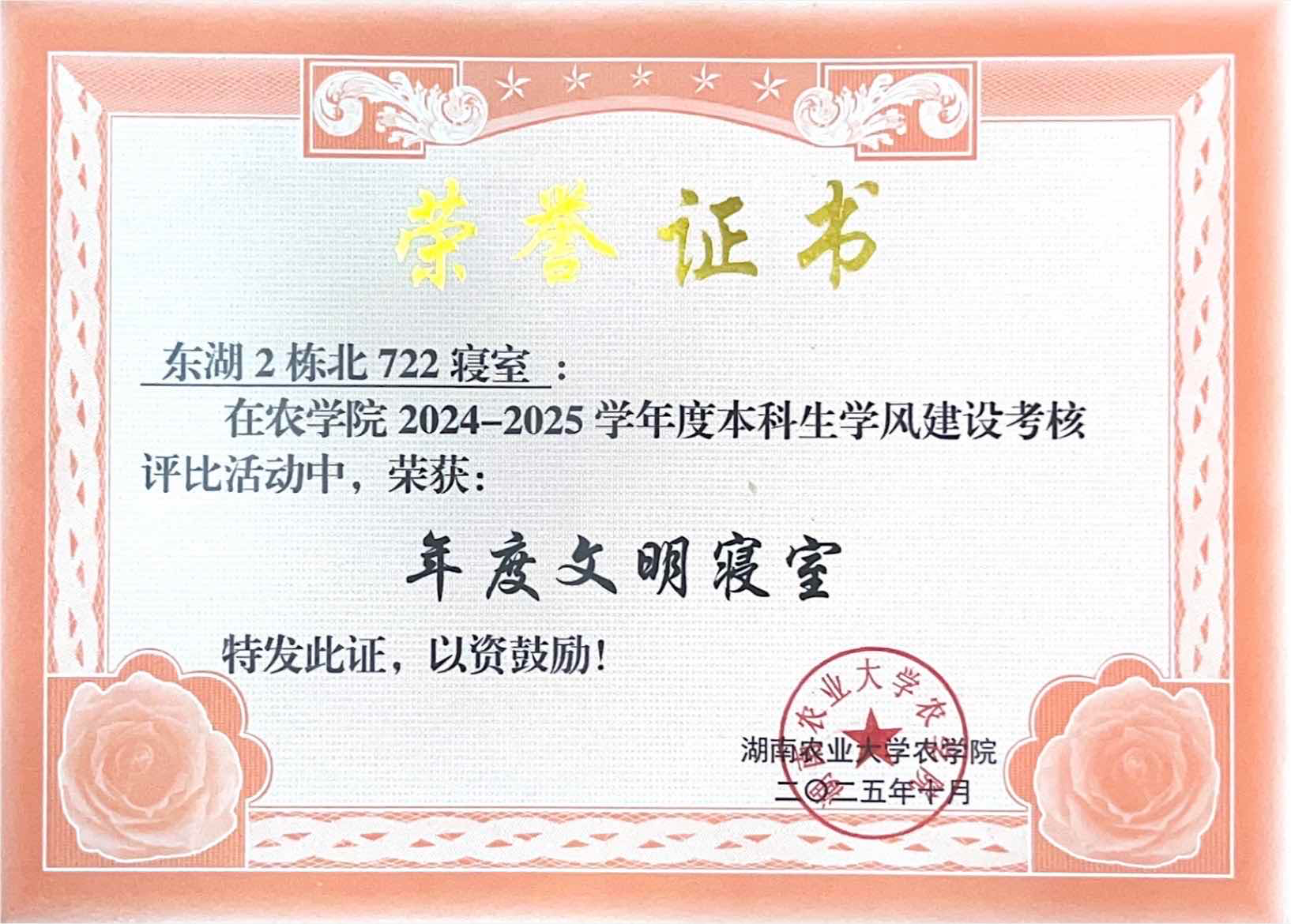 在朝夕相伴的校园时光里,她们五人同心同行,在彼此陪伴中共同成长,用协作与担当书写下一段段温暖又奋进的青春篇章。她们用心经营寝室生活,凭借默契配合与良好氛围,一同斩获年度文明寝室荣誉,让小小的寝室成为充满温暖与正能量的成长港湾。