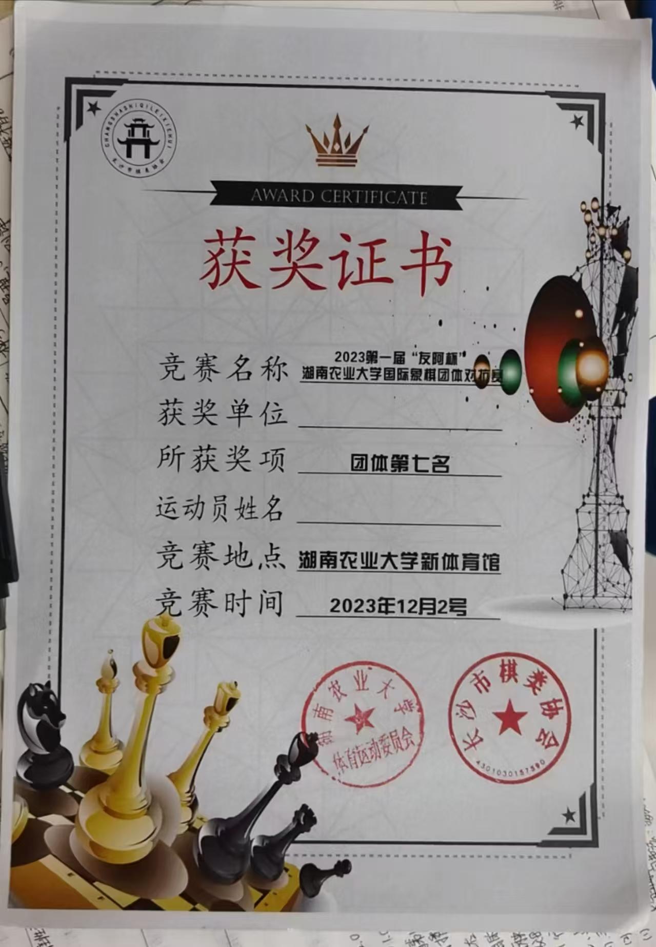 在校园赛事的舞台上,她们并肩出征,共同参与第一届“友阿杯”湖南农业大学国际象棋团体对抗赛。赛场上她们齐心协力、沉着应战,凭借团队配合与不懈拼搏,最终拿下第七名的佳绩,在竞技中收获了并肩作战的珍贵情谊,也实现了能力的共同提升。