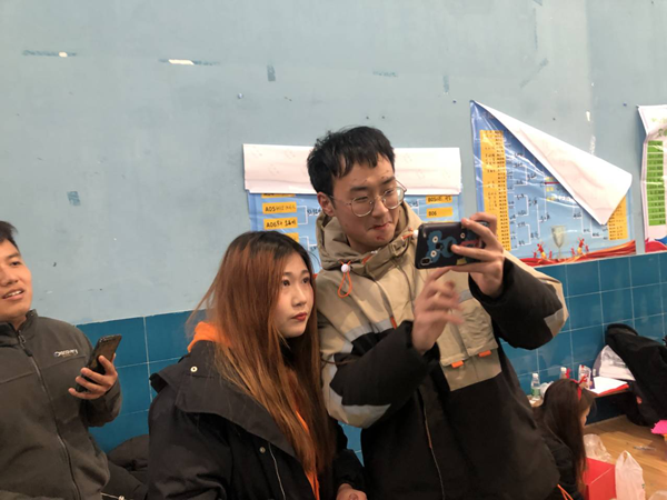 趣味运动班级赛游戏时,由站在每列首位队员开始,依次进行以下动作:两个人绕长绳,其余人站在绳中间位置同时起跳,完整完成10个。一号队员用乒乓球拍举着乒乓球跑步至二号队员所在位置。到达二号队员所在位置后,合体夹爆一个气球。二号队员牵鼻子原地转十圈,转完后跑到三号队员处击打锣鼓,两人吃一包小辣条即完成第二个动作。三号队员额头上放上饼干,过程不可以用手,手臂等,只能通过控制面部肌肉吃到。吃完饼干后三号队员蒙上眼睛,用画脸笔给旁边四号队员化口红和眉毛。要求把全嘴和眉毛都化上色。化好后,四号队员拿出手机与三号队员自拍一张。五号队员依靠两块泡沫板向前行进,行程中手、脚不得离触地,否则重来。到达终点后需用脸冲破保鲜膜,则完成第五个动作。五位队员集体摆成同一姿势,集体喊出“1.2.3茄子”,计时的同学拍照,拍照结束,则项目完成,计时停止。