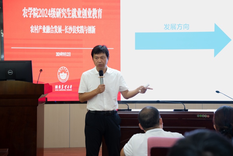 为深入贯彻落实乡村振兴战略,促进学院研究生在农业领域的就业创业工作,9月12日晚,农学院在隆平楼617会议室开展了一场以“农村产业融合发展——长沙县实践与创新”为题的就业创业教育。此次活动邀请到了长沙县农业农村局副局长曾建新作为主讲嘉宾,农学院党委徐辉副书记、农学院黄璜教授、环境生态学院徐华勤教授出席了此次讲座,长沙县农业农村局负责人、农学院全体研究生辅导员、2024级全体研究生新生参加。会议由农学院党委书记刘敏主持。