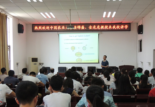 本网讯(农学院 罗红兵 郭崇炎 黎人萍)7月9日上午,农学院、研究生院、科技处和南方粮油作物协同创新中心特邀国家玉米改良中心主任、国家自然科学基金杰出青年基金获得者、国家“万人计划”科技创新领军人才入选者、中国农业大学赖锦盛教授和中国农业大学农学院院长、国家自然科学基金杰出青年基金获得者、国家“万人计划”科技创新领军人才入选者金危危教授来我校讲学。讲座由农学院院长张海清教授主持,校内外专家学者及学校相关院系研究生80余人聆听了本次精彩的学术讲座。
